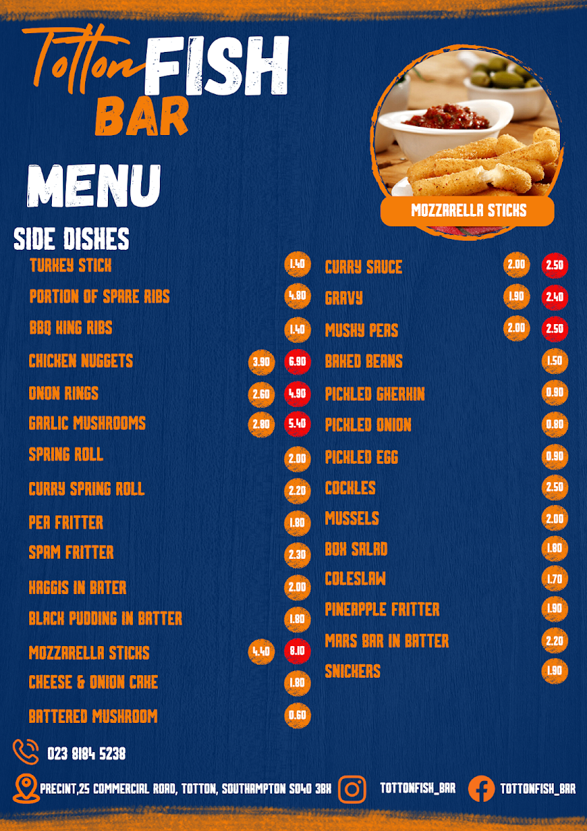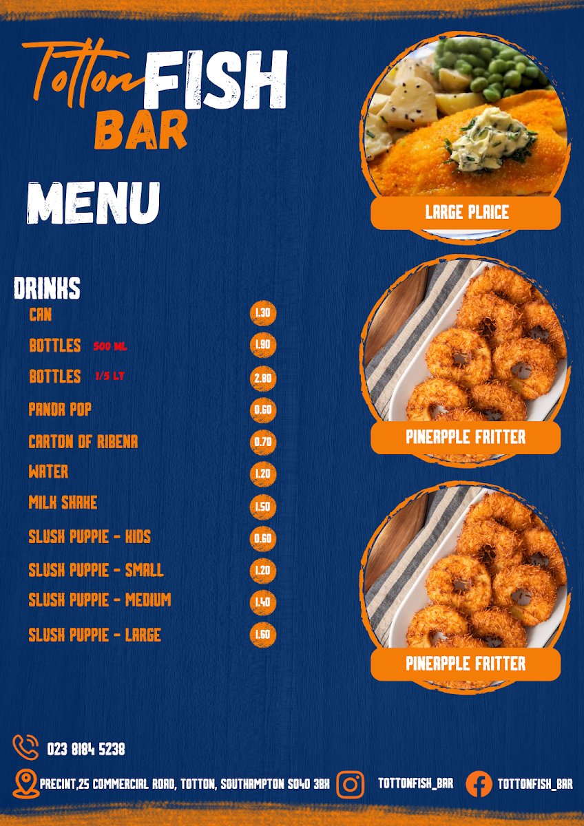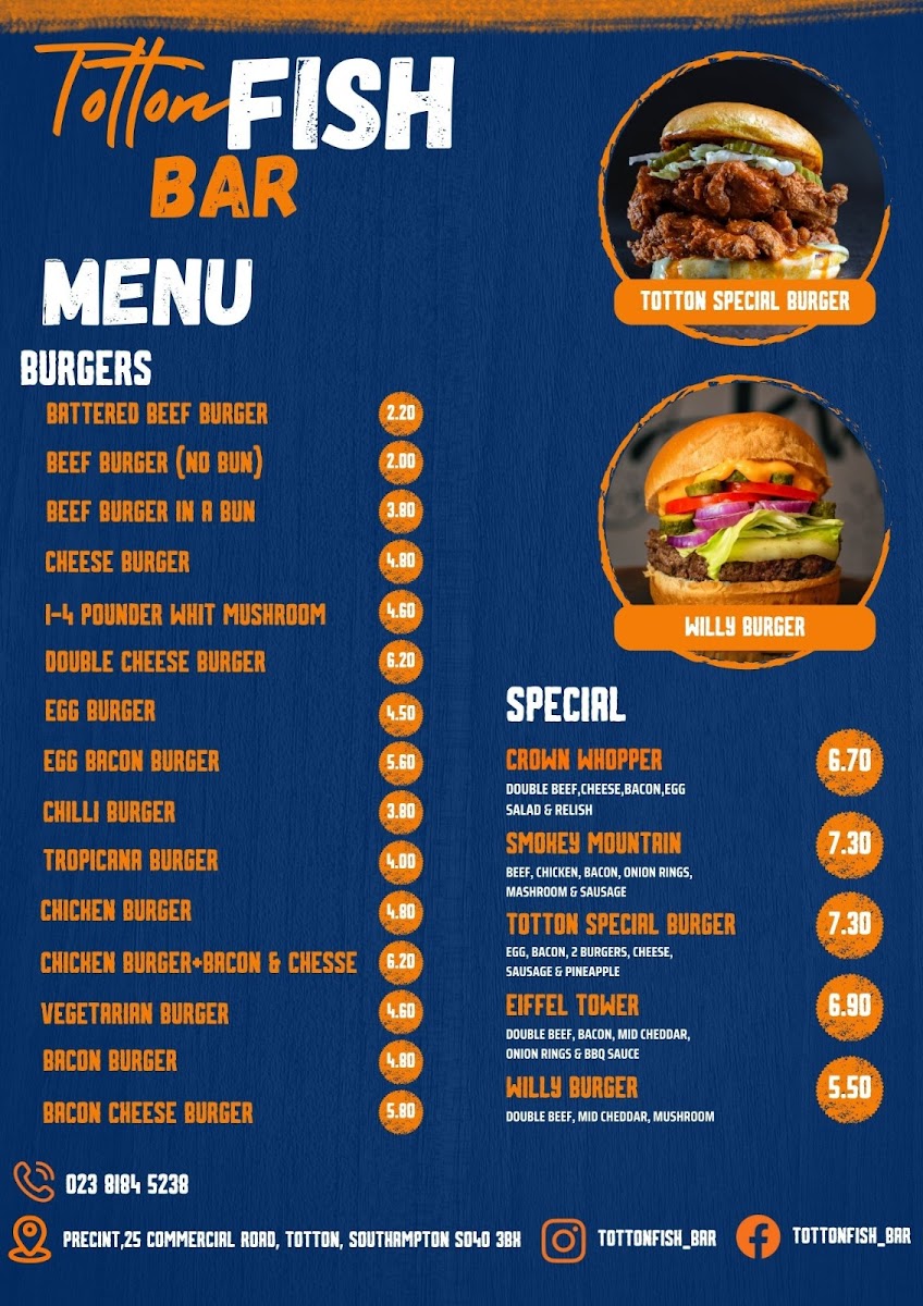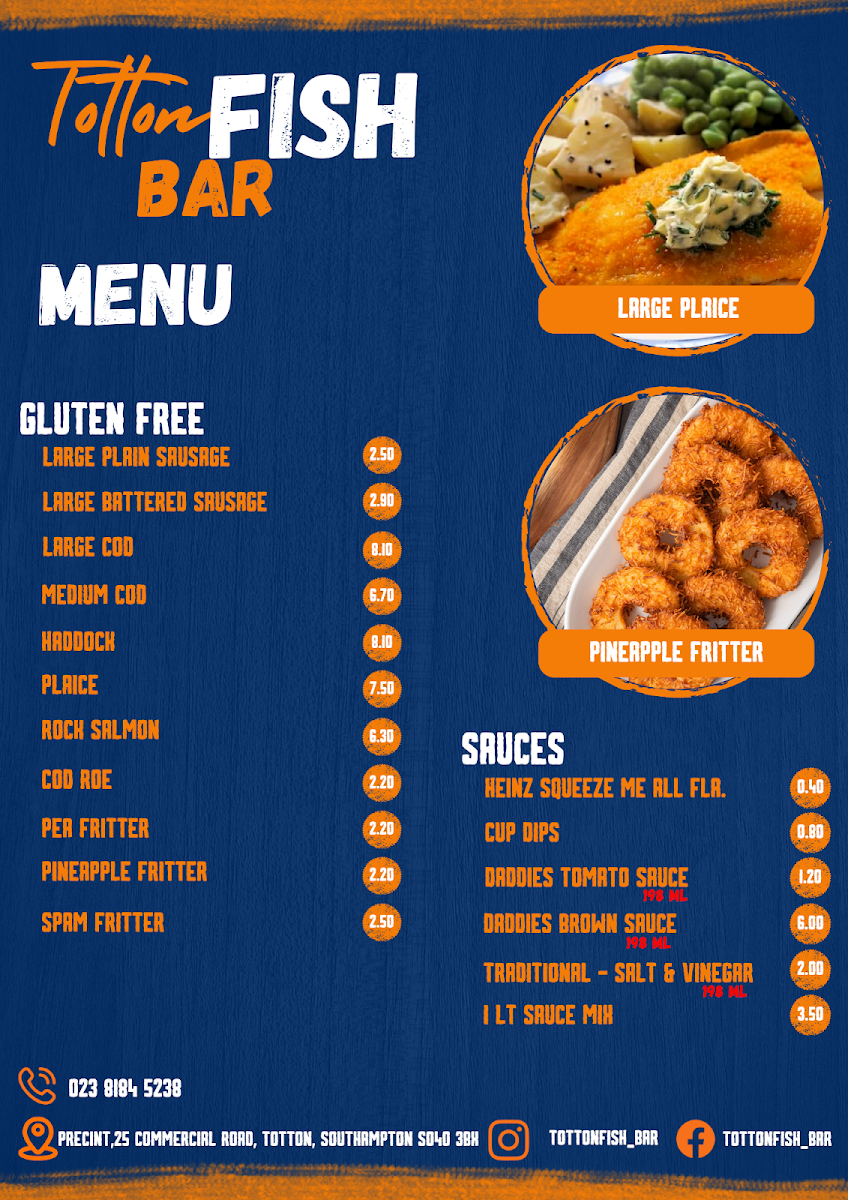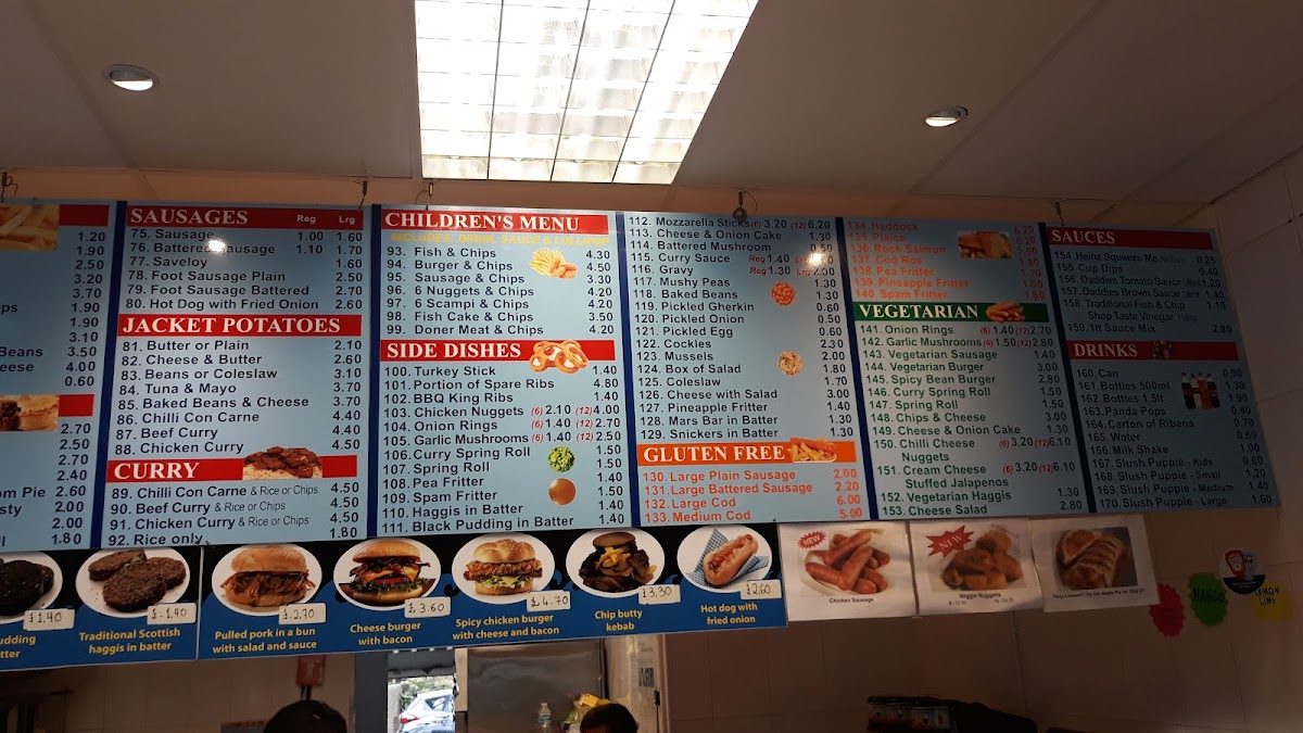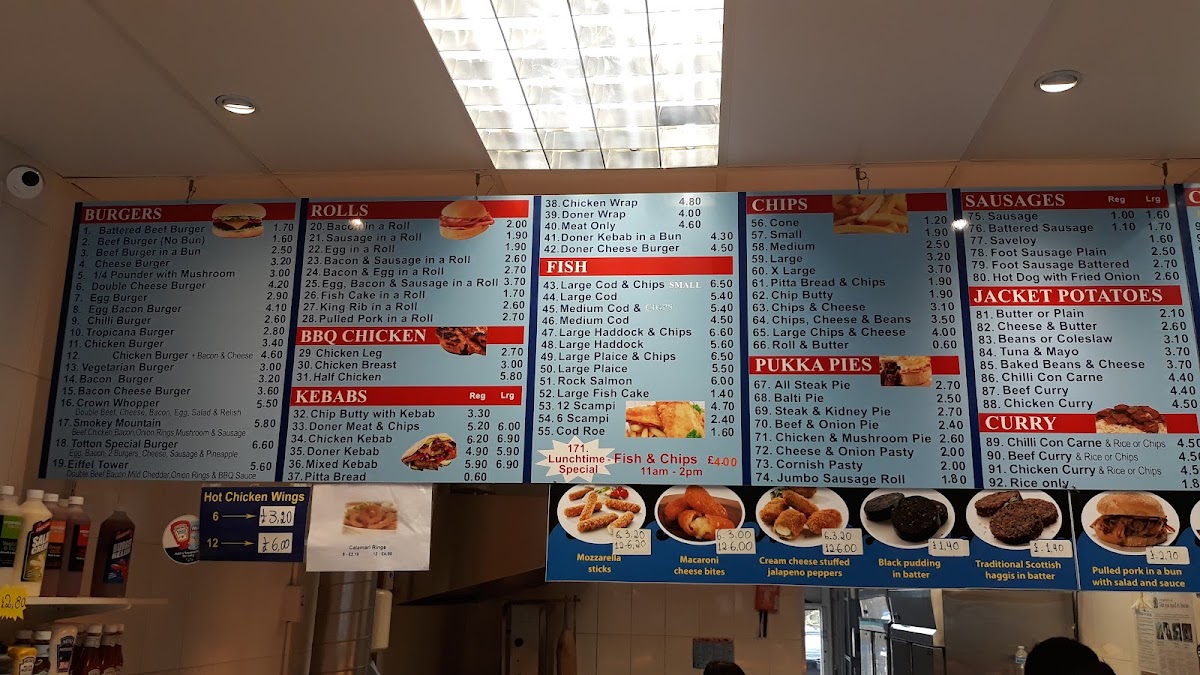 Totton Fish Bar offers a diverse and satisfying menu that caters to various tastes. For burger lovers, you can choose from a Battered Beef Burger, Beef Burger (No Bun), Cheese Burger, or even a 1/4 Pounder with Mushroom. If you're craving a quick snack, there are multiple roll options like Bacon in a Roll, Sausage in a Roll, and the ever-popular Bacon & Sausage in a Roll. For those who enjoy BBQ, they offer Chicken Leg, Chicken Breast, or even a Half Chicken. Their kebab range includes a Chip Butty with Kebab, Doner Meat & Chips in both regular and large sizes, as well as Chicken Kebabs. Fish enthusiasts can indulge in Large Cod & Chips, Medium Cod & Chips, or a Large Haddock & Chips, with Large Plaice also available. If you're in the mood for pies, try one of their Pukka Pies, such as the All Steak Pie, Steak & Kidney Pie, or Chicken & Mushroom Pie. The selection also includes classic Sausages (both regular and large), Battered Sausages, and even a Savaloy. Additionally, jacket potatoes come with various fillings like Cheese & Butter or Tuna & Mayo. You can also enjoy comforting curries like Beef Curry, Chicken Curry, or Chilli con Carne. For kids, there's a specialized menu featuring options like Fish & Chips, Burger & Chips, and 6 Nuggets & Chips. Side dishes such as BBQ King Ribs, Onion Rings, and Garlic Mushrooms are perfect for sharing. The restaurant also provides gluten-free choices, including Cod and Sausages, and vegetarian options like Vegetarian Sausage and Onion Rings. To complete your meal, choose from a range of sauces like Heinz Ketchup or Daddies Brown Sauce, and wash it down with a drink from their selection of Cans, Bottles, or Panda Pops.